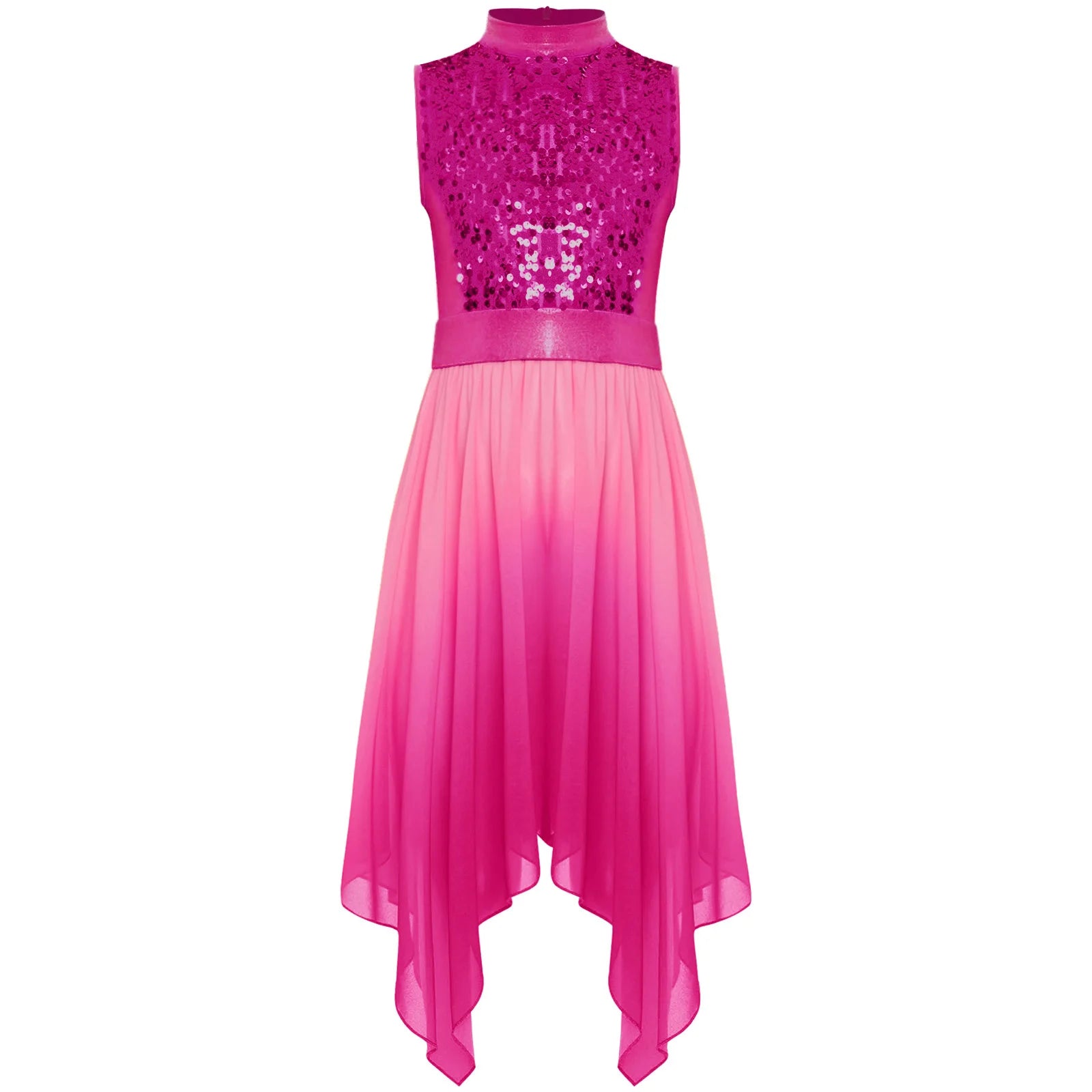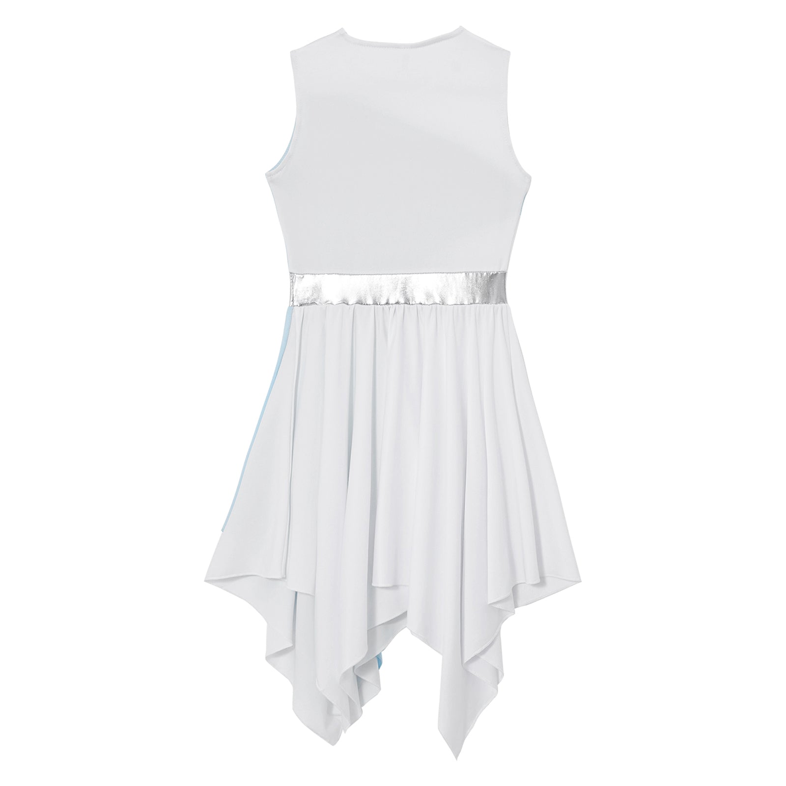 Sleeveless lyrical dance dress for girls, regular round neckline, metallic contrast color and patchwork design.